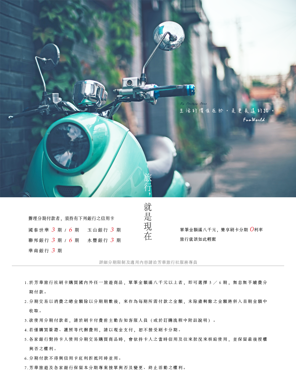於芳華旅行社刷卡購買國內外任一旅遊商品,單筆金額滿八千元以上者,即可選擇3/6期,無息無手續費分期付款。